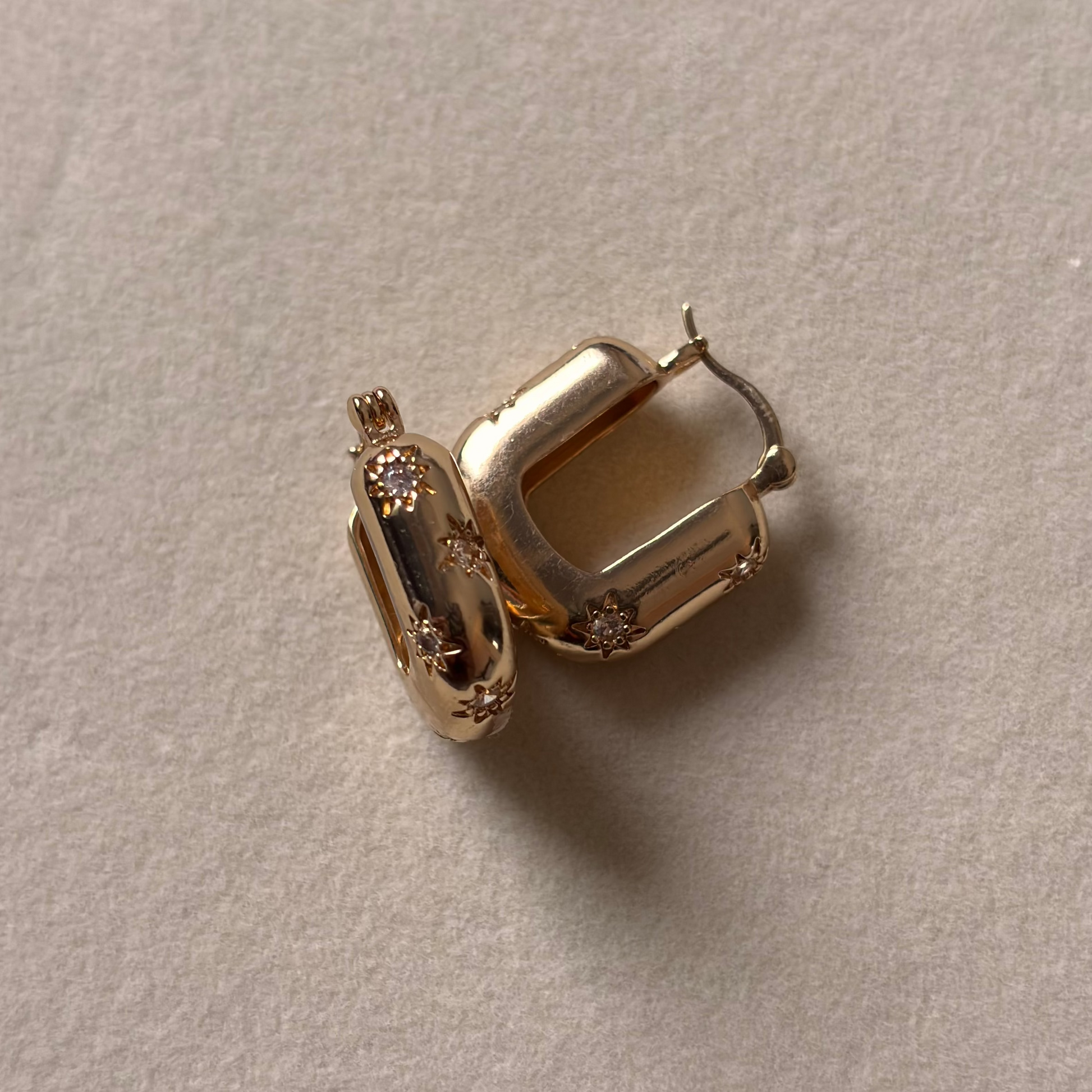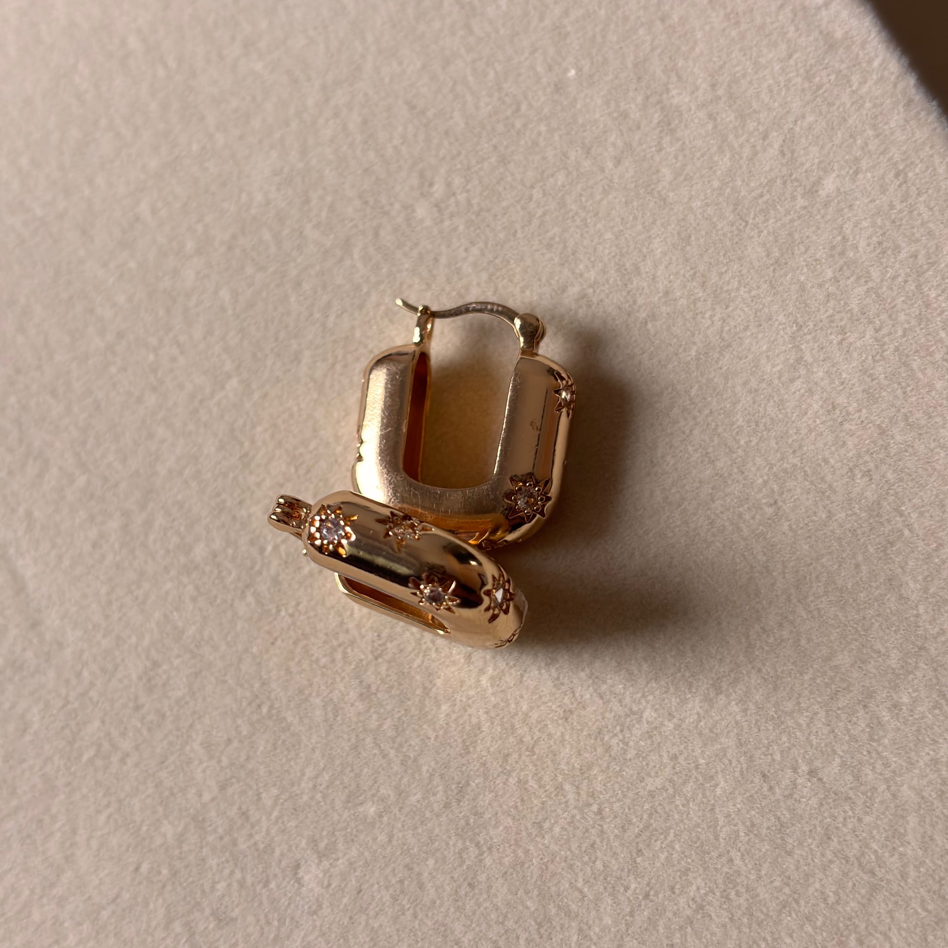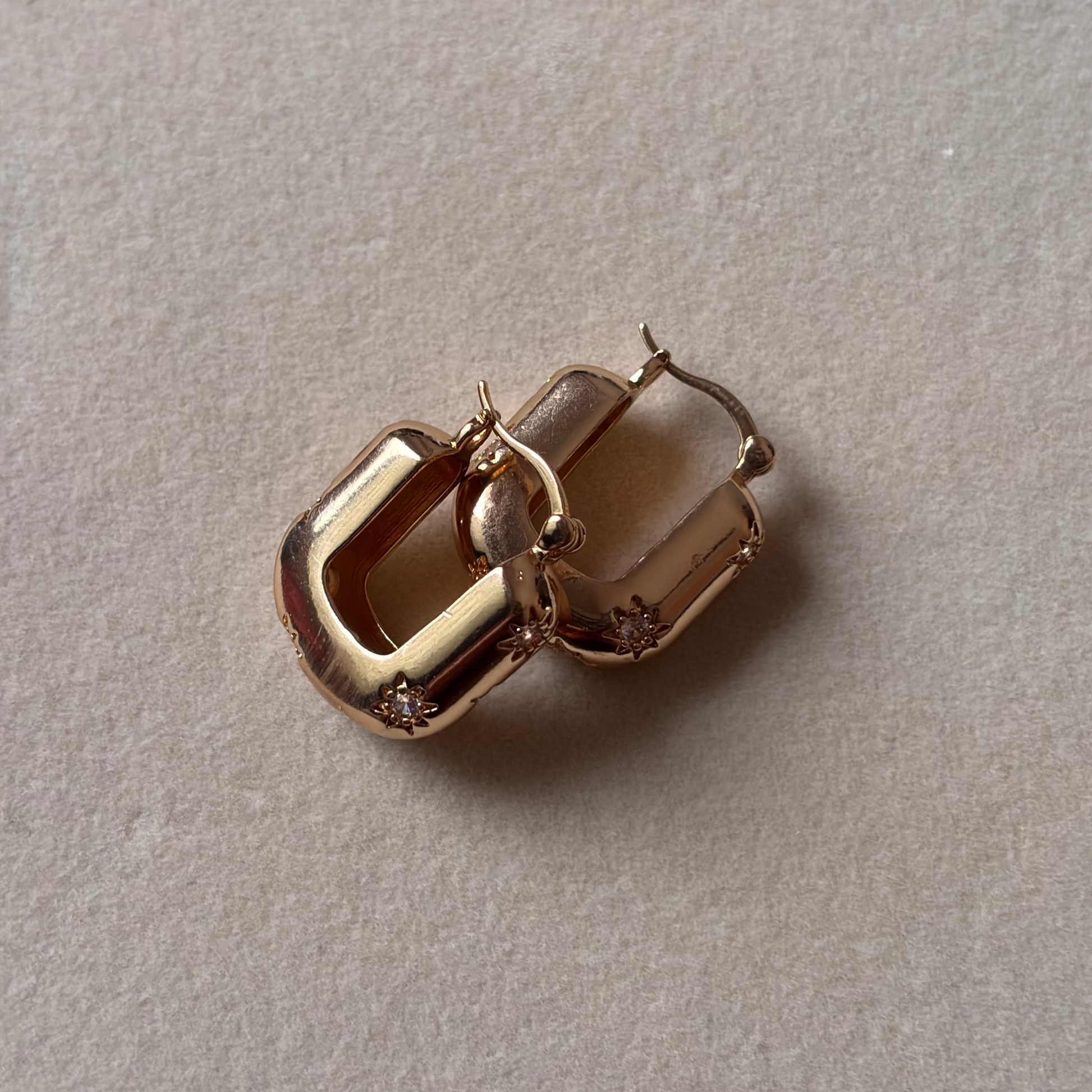 These chunky U-shaped hoops shine in glossy 18k gold plating, each surface engraved with delicate starbursts that catch the light thanks to brilliant crystal accents. Sculptural yet wearable, they’re perfect for elevating your everyday look or making a statement after dark.