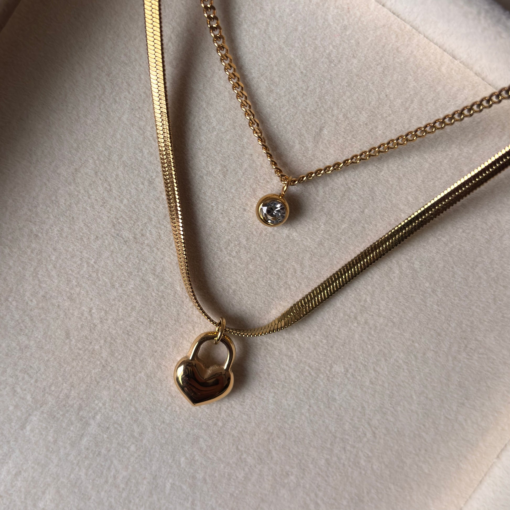 Heartlock Layered Necklace – Gold-Plated Duo Chain with Crystal Accent