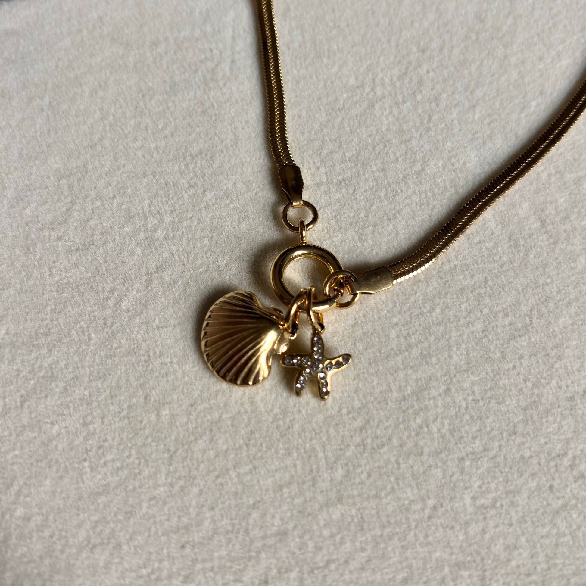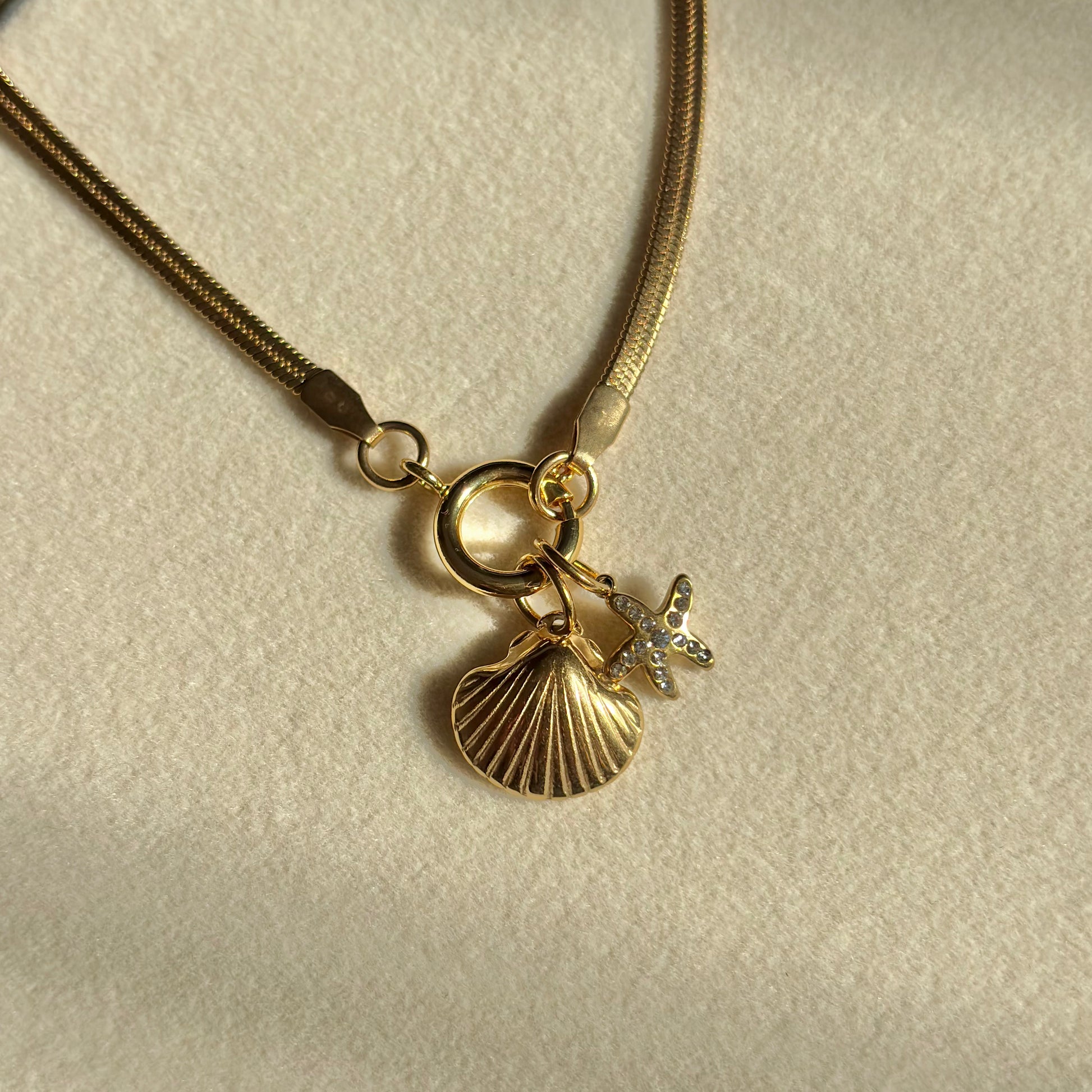 Shell And Star Charm Necklace features a delicate seashell and starfish design with a high-gloss gold plating. Designed for women who appreciate understated elegance with subtle sparkle, it rests delicately, adding a touch of refinement without drawing attention away from your personal style. Wear it with casual tees, formal blouses, or anything in between — this necklace complements every look with grace.